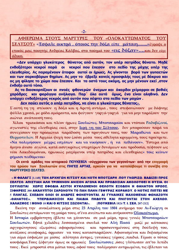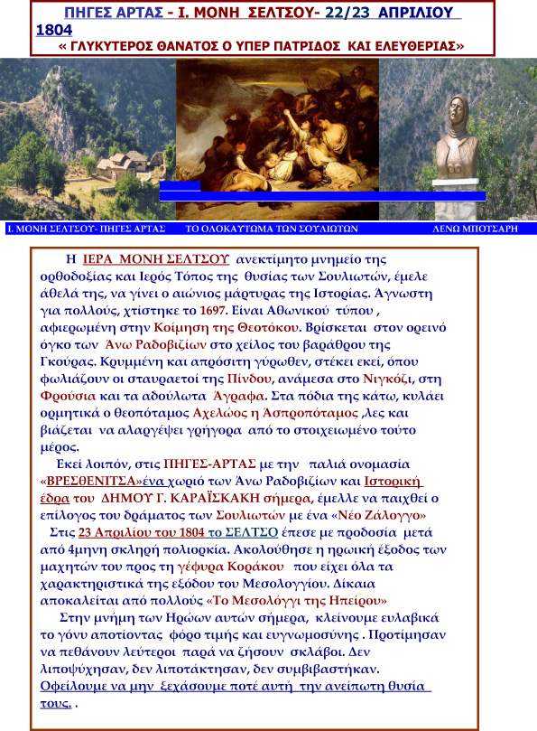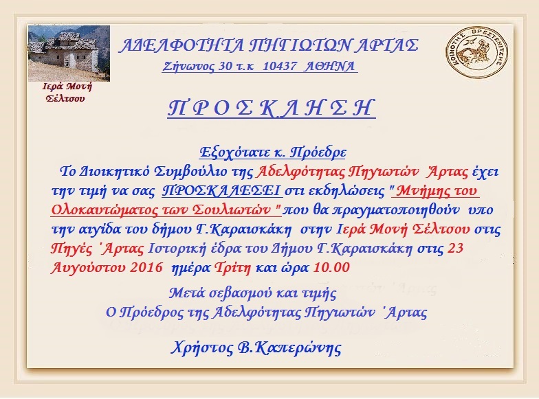 Από την Αδελφότητα Πηγιωτών επεδόθη η σχετική Πρόσκληση συνοδευόμενη από το Βιβλίο του συμπατριώτη μας Συγγραφέα-Εκπαιδευτικού Αριστείδη Σχισμένου «Το Ολοκαύτωμα των Σουλιωτών στο Σέλτσο» καθώς και αναλυτική επιστολή συνοδευόμενη με πληροφοριακό και φωτογραφικό υλικό.. Ανάλογη Πρόσκληση απηύθυνε και ο κ. Δήμαρχος. Ο Πρόεδρος της Δημοκρατίας δήλωσε εντυπωσιασμένος από την άγνωστη ιστορία της μεγάλης θυσίας των Σουλιωτών, απεδέχθη αμέσως την πρόσκληση και εξέφρασε τις ευχαριστίες του. Από πλευράς της Κας Υπουργού, των Βουλευτών, του Δημάρχου αλλά και ημών, του εκφράσαμε την χαρά μας για την αποδοχή που αποτελεί ύψιστη Πολιτειακή τιμή για τον Δήμο μας, την περιοχή μας, αλλά και για το χωριό μας τις Πηγές Άρτας Ιστορική έδρα του Δήμου Γ. Καραϊσκάκη.