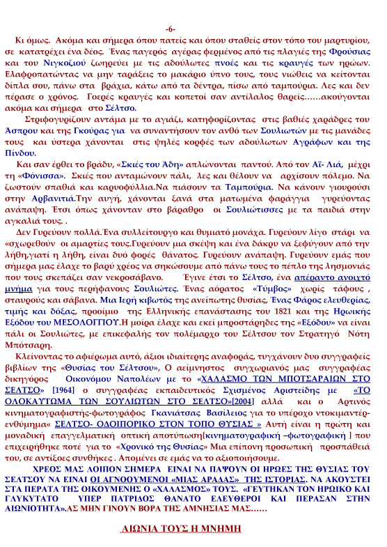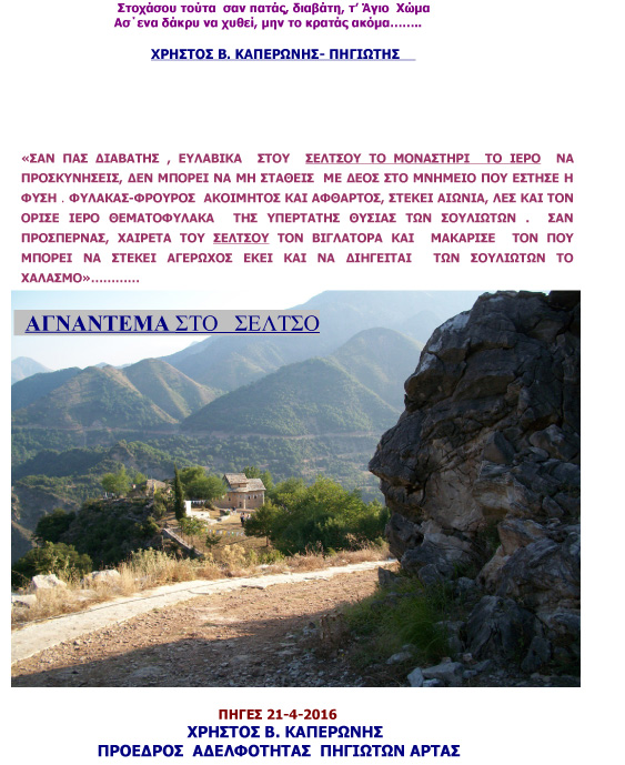 Το θετικό αποτέλεσμα αυτής της επίσκεψης οφείλεται στο πνεύμα συνεργασίας και ειλικρινούς υποστήριξης εκ των παρισταμένων και για το λόγο αυτό η Αδελφότητα Πηγιωτών ΄Αρτας αισθάνεται την ανάγκη να εκφράσει προς όλους τις θερμές ευχαριστίες για την αποφασιστική συνδρομή τους. Ήταν μία συλλογική ενέργεια που πέτυχε απόλυτα το σκοπό της που είναι η ανάδειξη του Ηρωικού Σελτσου αλλά και το καλό του τόπου μας.