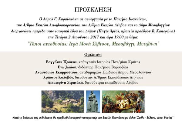 Στις 2 Αυγούστου 2017 ημέρα Τετάρτη και ώρα 19.00 Στις Πηγές Άρτας Ιστορική έδρα του δήμου Γ.Καραισκάκη και στην Πλατεία Προέδρου Βασ.Καπερώνη θα πραγματοποιηθεί ημερίδα Ιστορικού περιεχομένου που διοργανώνεται από τον Δήμο Γ. Καραϊσκάκη τον Δήμο Μεσολογγίου, το Πανεπιστήμιο Ιωαννίνων και τις Πρωτ/μιες Δ/νεις Εκπαίδευσης Αιτωλ/νίας και Λέσβου με θεματική ενότητα ΄΄ΤΟΠΟΙ ΑΥΤΟΘΥΣΙΑΣ-ΙΕΡΑ ΜΟΝΗ ΣΕΛΤΣΟΥ-ΜΕΣΣΟΛΟΓΓΙ-ΜΥΤΙΛΗΝΗ.΄΄