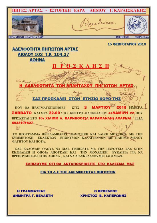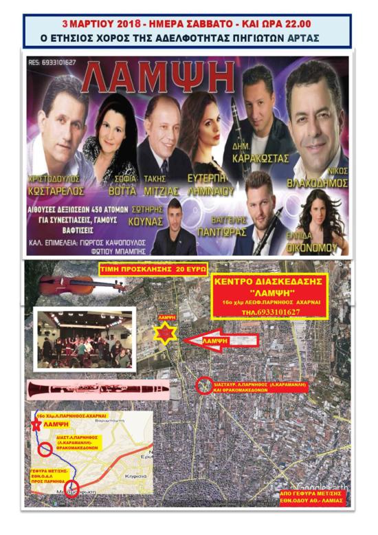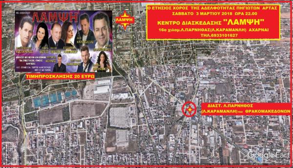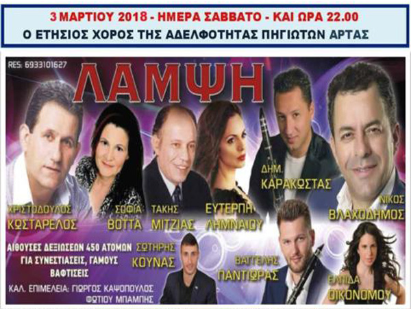 Η ΑΔΕΛΦΟΤΗΤΑ ΤΩΝ ΑΠΑΝΤΑΧΟΥ ΠΗΓΙΩΤΩΝ ΑΡΤΑΣ ΣΑΣ ΠΡΟΣΚΑΛΕΙ ΣΤΟΝ ΕΤΗΣΙΟ ΧΟΡΟ ΤΗΣ ΠΟΥ ΘΑ ΠΡΑΓΜΑΤΟΠΟΙΗΘΕΙ ΣΤΙΣ 3 ΜΑΡΤΙΟΥ 2018 ΗΜΕΡΑ ΣΑΒΒΑΤΟ ΚΑΙ ΩΡΑ 22.00 ΣΤΟ ΚΕΝΤΡΟ ΔΙΑΣΚΕΔΑΣΗΣ <<ΛΑΜΨΗ >> ΠΟΥ ΒΡΙΣΚΕΤΑΙ ΣΤΟ 160 ΧΙΛΙΟΜ Λ. ΠΑΡΝΗΘΟΣ(Λ.ΚΑΡΑΜΑΝΛΗ) ΑΧΑΡΝΑΙ. ΤΗΛ 6933101627