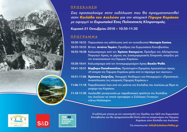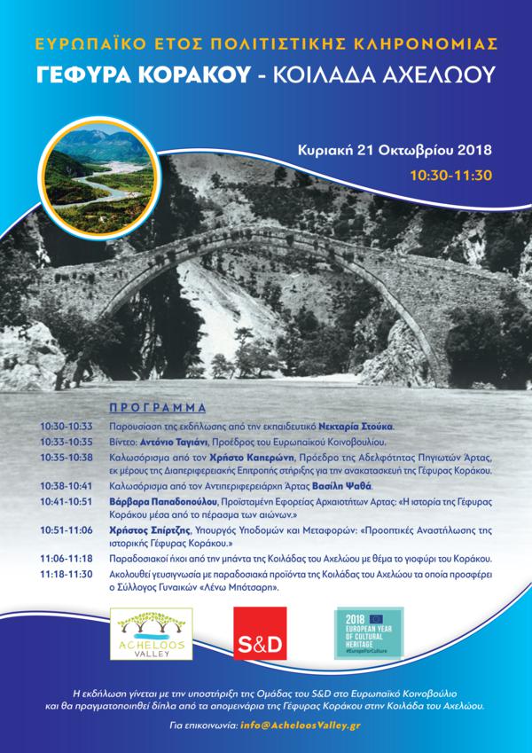 Στις 21 Οκτωβρίου 2018 ημέρα Κυριακή και από ώρα 10.30.π.μ στις Πηγές ΄Αρτας της Κοιλάδας του Αχελώου Ιστορική έδρα του Δήμου Γ.Καραισκάκη και στο χώρο της Θρυλικής Γέφυρας Κοράκου, διοργανώνεται εκδήλωση αφιερωμένη σε αυτή και στις προσπάθειες που γίνονται για την αναστήλωση της.Η εκδήλωση εντάσσεται στον κύκλο του εορτασμού του Ευρωπαϊκού έτους Πολιτιστικής Κληρονομιάς και διοργανώνεται με πρωτοβουλία του συμπατριώτη μας -στελέχους του Ευρωπαϊκού Κοινοβουλίου κ. Αντώνη Κοσσυβάκη με την στήριξη της ομάδας του S&D του Ευρωπαϊκού Κοινοβουλίου. Στην ημερίδα αυτή σύμφωνα με το πρόγραμμα θα λάβουν μέρος ο Υπουργός Υποδομών κ. Χρήστος Σπίρτζης ο Αντιπεριφερειάρχης Αρτας κ. Βασίλης Ψαθάς, και η Διευθύντρια της Εφορείας Αρχαιοτήτων του Νομού ΄Αρτας κ. Βαρβάρα Παπαδοπούλου. Την εκδήλωση συντονίζει η εκπαιδευτικός Νεκταρία Στούκα .Σύντομο χαιρετισμό μέσω βίντεο θα απευθύνει και ο πρόεδρος του Ευρωπαϊκού Κοινοβουλίου ΑΝΤΟΝΙΟ ΤΑΓΙΑΝΙ που στηρίζει ένθερμα αυτή την προσπάθεια. Επίσης χαιρετισμό θα απευθύνει και ο Πρόεδρος της Αδελφότητας Πηγιωτών Άρτας Χρήστος Καπερώνης ως εκπρόσωπος της Διαπεριφερειακής Οργανωτικής Επιτροπής Άρτας –Καρδίτσας για την Αναστήλωση της Γέφυρας Κοράκου.