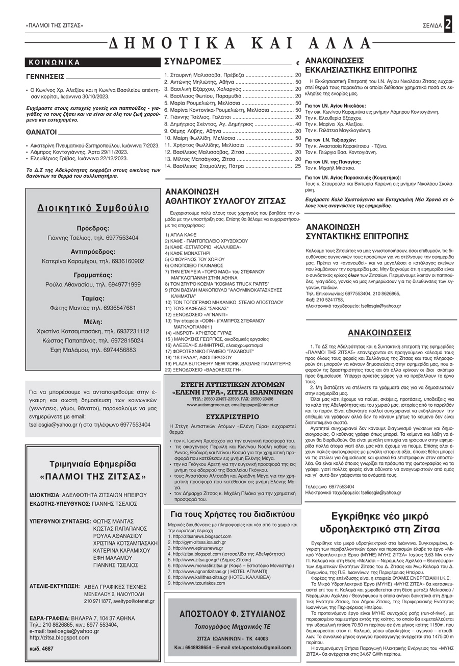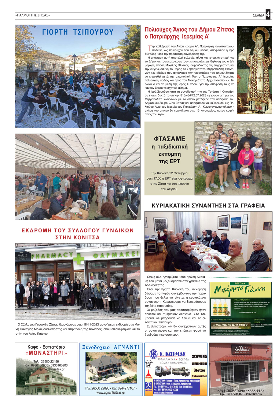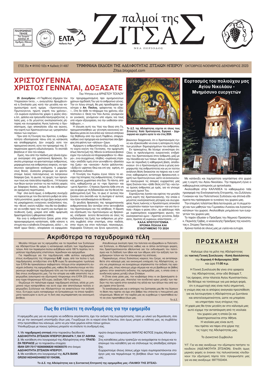 Εφημερίδα Αδελφότητας Ζιτσαίων Ηπείρου.Αριθμός φύλλου 102.Οκτώβριος-Νοέμβριος-Δεκέμβριος 2023