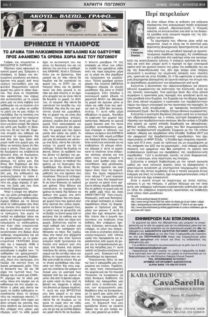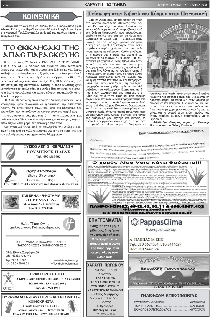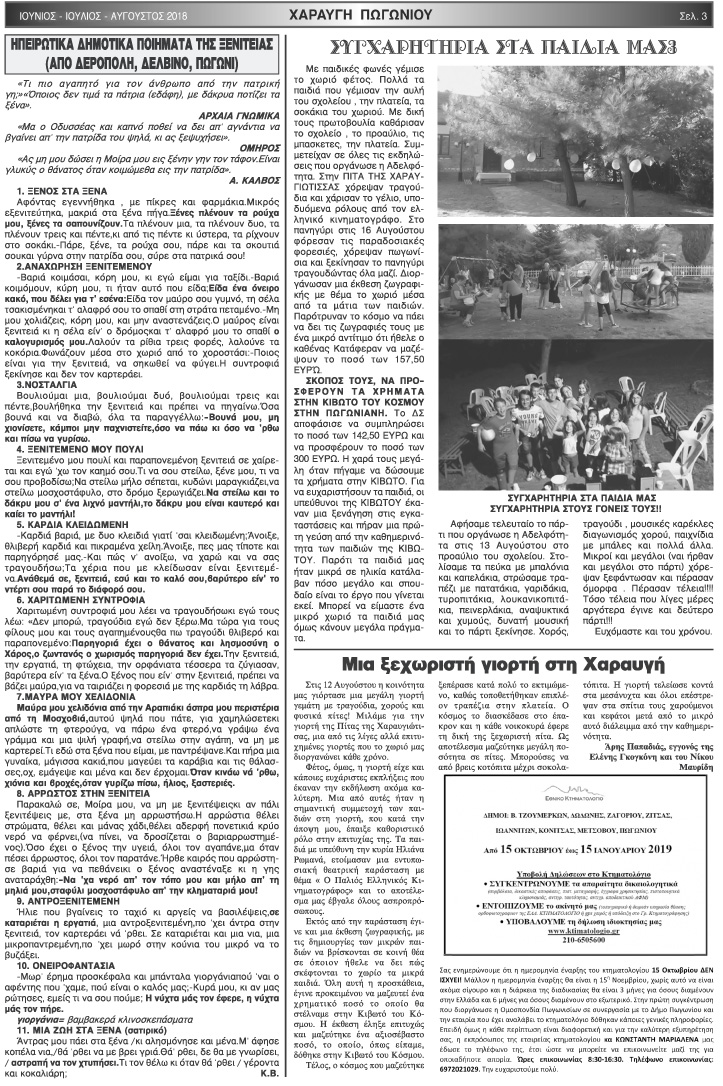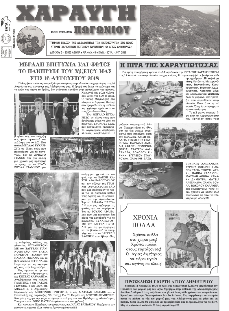 Εφημερίδα Αδελφότητας Χαραυγής Πωγωνίου.Αριθμ.Φύλλου 48.Ιούνιος-Ιούλιος-Αύγουστος 2018