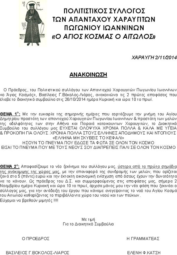 ΑΝΑΚΟΙΝΩΣΗ ΠΟΛΙΤΙΣΤΙΚΟΥ ΣΥΛΛΟΓΟΥ ΧΑΡΑΥΓΗΣ