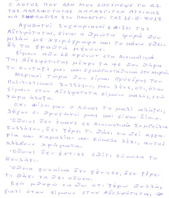 Ο λόγος που ζήτησε να εκφωνήσει ο Πρόεδρος του Πολιτιστικού Συλλόγου Χαραυγής στο πανηγύρι 16 Αυγούστου 2012