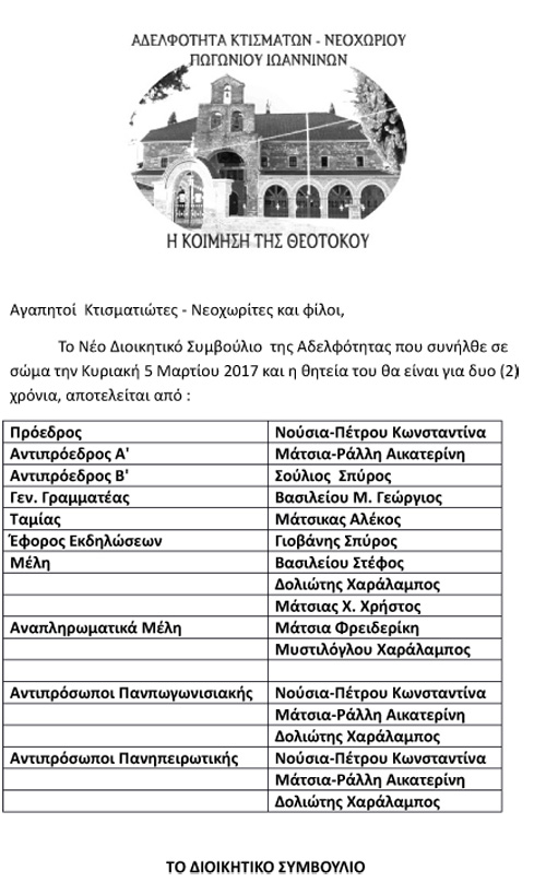 Νέο Δ.Σ. Αδελφότητας Κτισμάτων & Νεοχωριτών Πωγωνίου 2017--2019