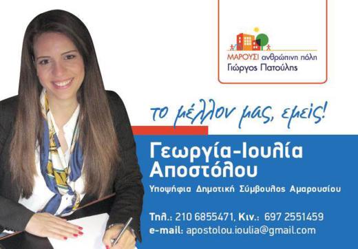 Η Ηπειρώτισσα Γεωργία-Ιουλία Αποστόλου, που δραστηροποιείται στον Σύνδεσμο Γυναικών Ηπείρου Αττικής, υποψήφια δημοτική σύμβουλος Αμαρουσίου με τον συνδυασμό του Γιώργου Πατούλη ''Μαρούσι Ανθρώπινη πόλη''