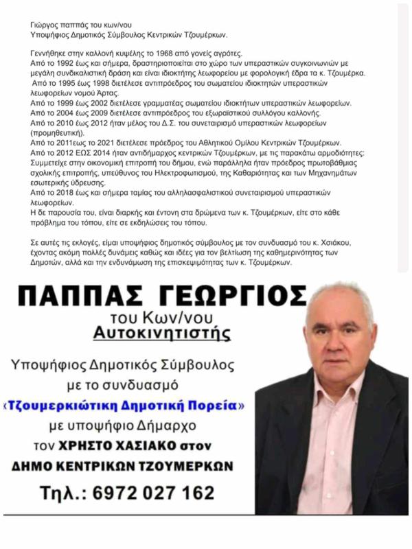 Παππάς Γεώργιος. Υποψήφιος Δημοτικός Σύμβουλος. 'Κεντρικά Τζουμέρκα''. Παππάς Γεώργιος.Υποψήφιος Δημοτικός Σύμβουλος.''Κεντρικά Τζουμέρκα''... Tweet Προηγούμενο Επόμενο