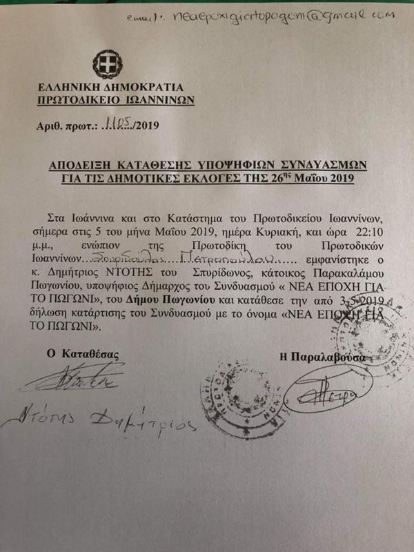 ''Νέα Εποχή για το Πωγώνι''.Ντότης Δημήτριος.Υποψήφιος δήμαρχος Πωγωνίου.Κατάθεση υποψηφιότητας στο Πρωτοδικείο Ιωαννίνων.