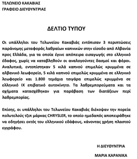 Τελωνείο Κακαβιάς-Δελτίο Τύπου