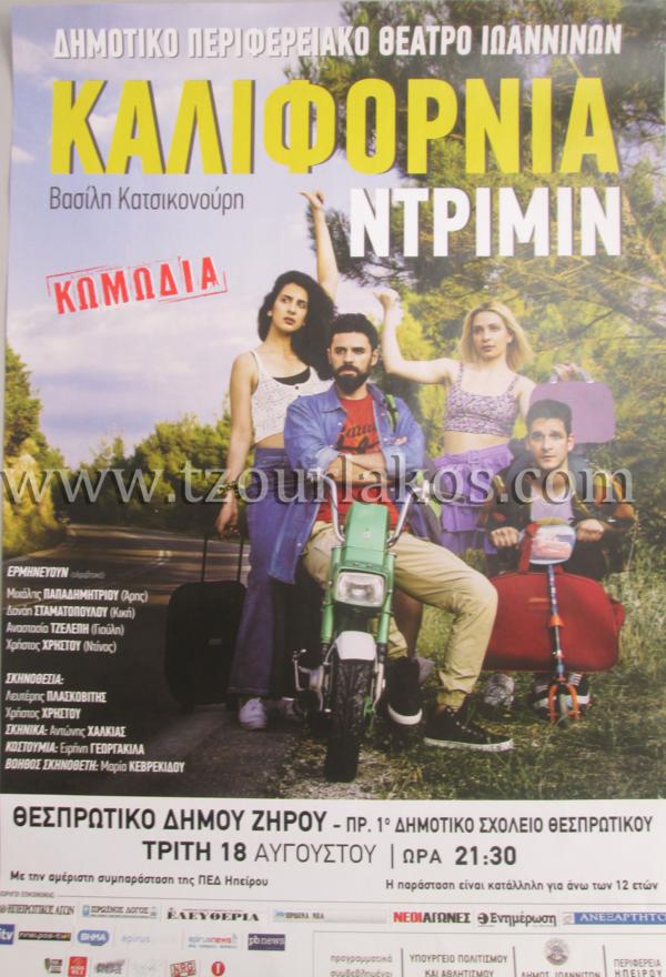 Την Τρίτη 18 Αυγούστου στον αύλειο χώρο του Δημαρχείου Θεσπρωτικού (πρώην Α’ δημοτικό Σχολείο) η θεατρική ομάδα του Δημοτικού Περιφερειακού Θέατρου Ιωαννίνων θ’ ανεβάσει την κωμωδία του Βασίλη Κατσικονούρη “Καλιφόρνια Ντρίμιν”. Η παράσταση θ’ αρχίσει στις 9.30 μ.μ. και είναι κατάλληλη για άνω των 12 ετών.