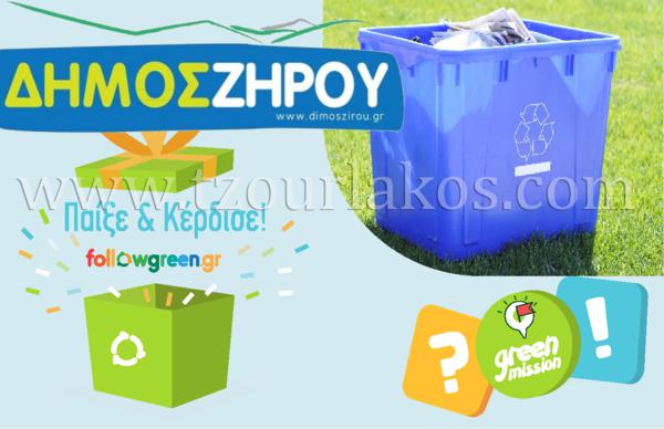 Ο Δήμος Ζηρού, υπογραμμίζοντας για μία ακόμη φορά την ανάγκη τήρησης των μέτρων για την πανδημία ώστε να μείνουμε όλοι ασφαλείς και να βγούμε δυνατοί από τη σημερινή δύσκολη συγκυρία, προσφέρει στους συμπολίτες την ευκαιρία να ενημερωθούν και να έρθουν πιο κοντά στον κόσμο της ανακύκλωσης, μέσα από «Πράσινες Αποστολές - Green Missions» εκπαιδευτικού χαρακτήρα. Ο πολίτης βασισμένος στο ενημερωτικό υλικό καλείται να ολοκληρώσει ορισμένους στόχους από τους οποίους κερδίζει επιπλέον πόντους επιβράβευσης και παράλληλα αποκτά συμμετοχή σε κληρώσεις Followgreen για την απόκτηση δώρων.