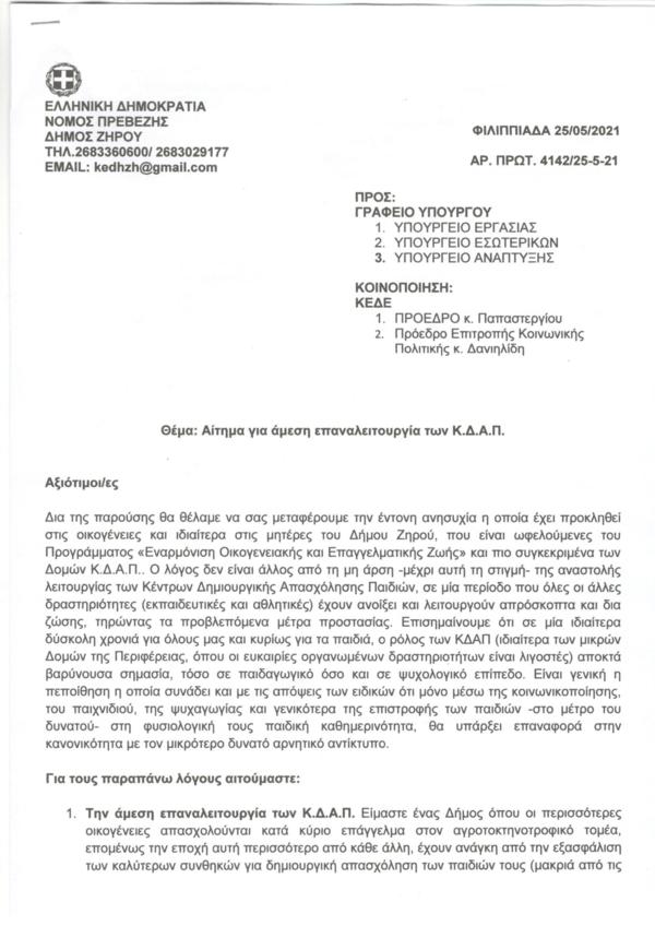 Δια της παρούσης θα θέλαμε να σας μεταφέρουμε την έντονη ανησυχία η οποία έχει προκληθεί στις οικογένειες και ιδιαίτερα στις μητέρες του Δήμου Ζηρού, που είναι ωφελούμενες του Προγράμματος «Εναρμόνιση Οικογενειακής και Επαγγελματικής Ζωής» και πιο συγκεκριμένα των Δομών Κ.Δ.Α.Π.. Ο λόγος δεν είναι άλλος από τη μη άρση -μέχρι αυτή τη στιγμή- της αναστολής λειτουργίας των Κέντρων Δημιουργικής Απασχόλησης Παιδιών, σε μία περίοδο που όλες οι άλλες δραστηριότητες (εκπαιδευτικές και αθλητικές) έχουν ανοίξει και λειτουργούν απρόσκοπτα και δια ζώσης, τηρώντας τα προβλεπόμενα μέτρα προστασίας. Επισημαίνουμε ότι σε μία ιδιαίτερα δύσκολη χρονιά για όλους μας και κυρίως για τα παιδιά, ο ρόλος των ΚΔΑΠ (ιδιαίτερα των μικρών Δομών της Περιφέρειας, όπου οι ευκαιρίες οργανωμένων δραστηριοτήτων είναι λιγοστές) αποκτά βαρύνουσα σημασία, τόσο σε παιδαγωγικό όσο και σε ψυχολογικό επίπεδο. Είναι γενική η πεποίθηση η οποία συνάδει και με τις απόψεις των ειδικών ότι μόνο μέσω της κοινωνικοποίησης, του παιχνιδιού, της ψυχαγωγίας και γενικότερα της επιστροφής των παιδιών -στο μέτρο του δυνατού- στη φυσιολογική τους παιδική καθημερινότητα, θα υπάρξει επαναφορά στην κανονικότητα με τον μικρότερο δυνατό αρνητικό αντίκτυπο.