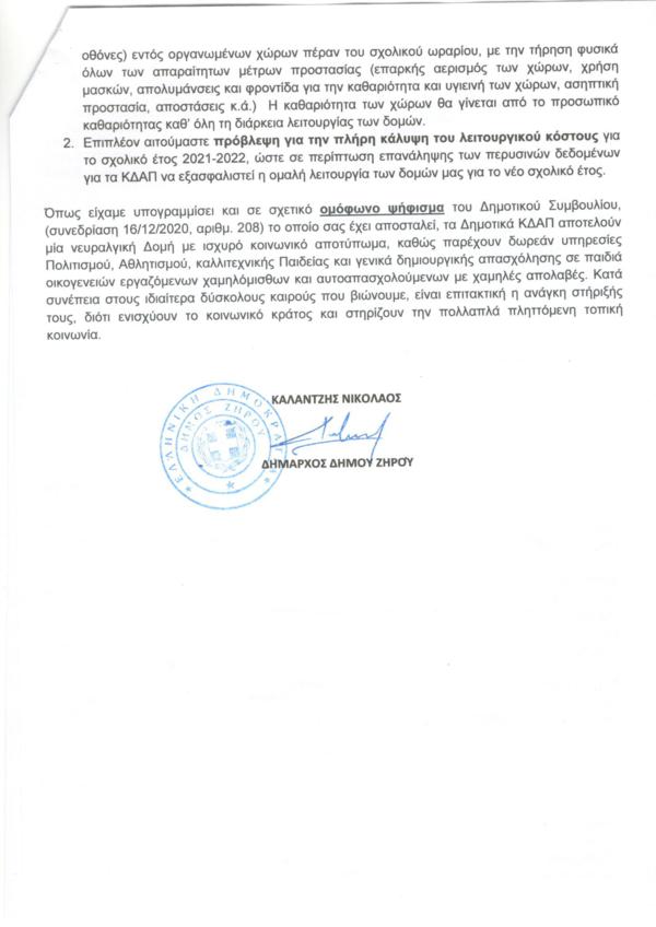 - Επιπλέον αιτούμαστε πρόβλεψη για την πλήρη κάλυψη του λειτουργικού κόστους για το σχολικό έτος 2021-2022, ώστε σε περίπτωση επανάληψης των περυσινών δεδομένων για τα ΚΔΑΠ να εξασφαλιστεί η ομαλή λειτουργία των δομών μας για το νέο σχολικό έτος.