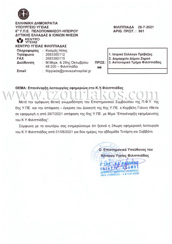Μερική ικανοποίηση προκαλεί η απόφαση του διοικητή της 6ης ΥΠΕ κ. Γιάννη Καρβέλη για επανέναρξη από την 1η Αυγούστου, των εφημεριών στο Κέντρο Υγείας Φιλιππιάδας. Πιο συγκεκριμένα, σύμφωνα με την απόφαση της 6ης Υ.Π.Ε. το Κέντρο Υγείας θα εφημερεύει σε 24ωρη βάση δύο ημέρες της εβδομάδας, κάθε Τετάρτη και Σάββατο.