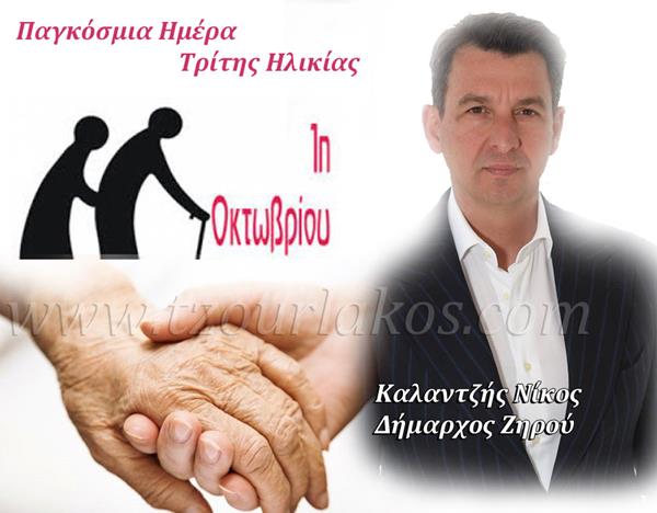 Με αφορμή τη σημερνή Παγκόσμια Ημέρα ηλικιωμένων ο Δήμαρχος Ζηρού κ. Νικόλαος Καλαντζής προέβη στο ακόλουθο μήνυμα: «Η 1η Οκτωβρίου έχει καθιερωθεί από τον ΟΗΕ ως παγκόσμια ημέρα ηλικιωμένων. Είναι η μέρα που μας υπενθυμίζει ότι οι μεγαλύτερες γενιές, είναι οι γονείς που μας μεγάλωσαν, μας πρόσφεραν απλόχερα την αγάπη τους, μας στήριξαν και μας καθοδήγησαν σε εποχές δύσκολες. Είναι οι δάσκαλοί μας και γενικά οι άνθρωποι στους οποίους χρωστάμε το ζην αλλά και το ευ ζην.