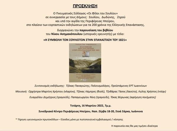 Την Τετάρτη 16 Μαρτίου και ώρα 7 μ.μ. στο Συνεδριακό Κέντρο της Περιφέρειας Ηπείρου, το οποίο βρίσκεται στη διεύθυνση Ναπ. Ζέρβα 18-20 –Στοά Σάρκα- στα Ιωάννινα, θα γίνει η παρουσίαση του βιβλίου του κ. Νίκου Ασημακόπουλου (ιστορικού –ερευνητή) με τίτλο: «Η συμβολή των Σουλιωτών στην ελληνική επανάσταση του 1821».