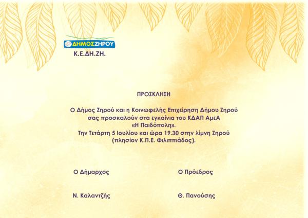 Σας προσκαλούμε στα εγκαίνια του ΚΔΑΠ Αμεα "Η Παιδόπολη" τα οποία θα πραγματοποιηθούν την Τετάρτη 5 Ιουλίου και ώρα 19.30 στη λίμνη Ζηρού (πλησίον του ΚΠΕ Φιλιππιάδας)