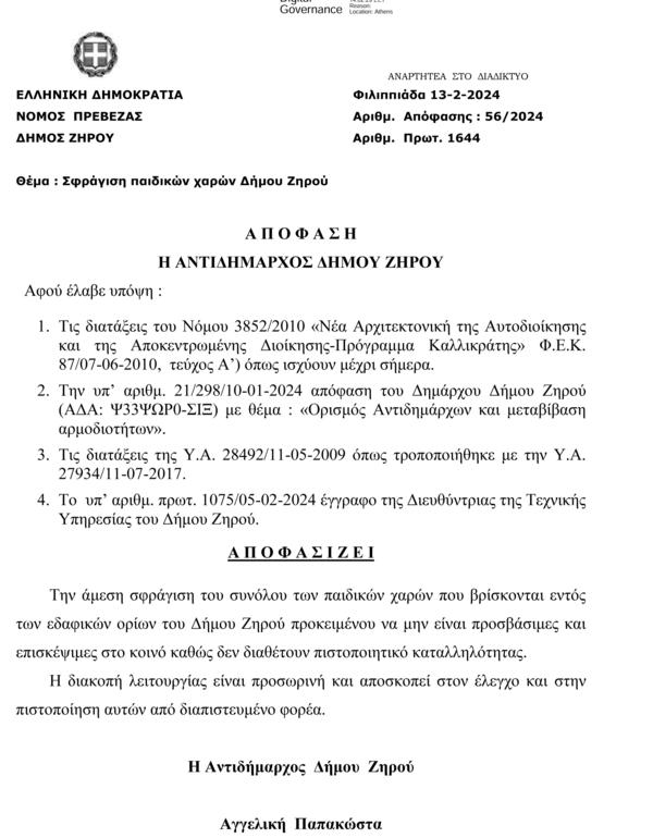 Η νέα δημοτική αρχή Ζηρού προχωρά σε αυτή την απόφαση, έχοντας ως πρώτο μέλημα την ασφάλεια των παιδιών που παίζουν στις παιδικές χαρές και των οικογενειών τους.