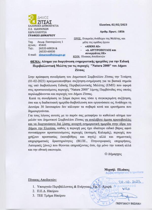Τη διοργάνωση ανοιχτής ενημερωτικής ημερίδας στην Ελεούσα με αντικείμενο την Ειδική Περιβαλλοντική Μελέτη για τις προστατευόμενες περιοχές "Natura 2000" της λίμνης Παμβώτιδας στις οποίες περιλαμβάνονται και περιοχές του Δήμου Ζίτσας ζητά ο Δήμαρχος Μιχάλης Πλιάκος, με επιστολή του προς τις εταιρείες – αναδόχους της σύνταξης της Ειδικής Περιβαλλοντικής Μελέτης (Ε.Μ.Π.) προκειμένου να ενημερωθούν όλοι οι φορείς και πολίτες για τις αλλαγές που επιφέρουν σε σημαντικές παραγωγικές δραστηριότητες.