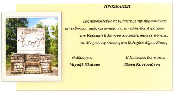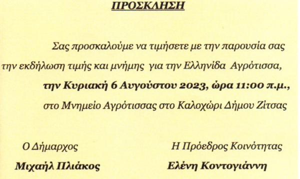 Ζίτσα: Εκδήλωση τιμής και μνήμης στην Ελληνίδα Αγρότισσα την Κυριακή... Ζίτσα: Εκδήλωση τιμής και μνήμης στην Ελληνίδα Αγρότισσα την Κυριακή 6 Αυγούστου. Tweet Προηγούμενο Επόμενο