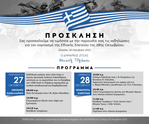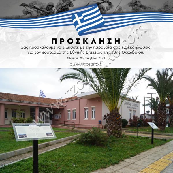 Εκδηλώσεις τιμής και μνήμης στο πλαίσιο του εορτασμού της εθνικής επετείου της 28ης Οκτωβρίου 1940 διοργανώνει ο Δήμος Ζίτσας σε συνεργασία με τους τοπικούς φορείς των Κοινοτήτων το διήμερο 27-28 Οκτωβρίου 2023.