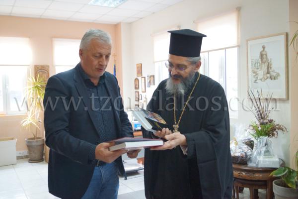 Σε μια συμβολική κίνηση ο Δήμαρχος πρόσφερε στο Μητροπολίτη εκδόσεις με βυζαντινά μνημεία και ναούς του Δήμου Ζίτσας και του ευχήθηκε υγεία, δύναμη και μακροημέρευση στη νέα αποστολή του. “ Με τη διακονία σας να γιγαντώσετε το έργο της Μητρόπολης προς όφελος όλων των πιστών”, ανέφερε χαρακτηριστικά ο κ. Πλιάκος. Από την πλευρά του ο Σεβασμιότατος αντιδώρισε στο Δήμαρχο την εικόνα της Παναγίας Τρυπητής και καλάθι με τοπικά προϊόντα και αντάλλαξαν ευχές ενόψει των εορτών των Χριστουγέννων.