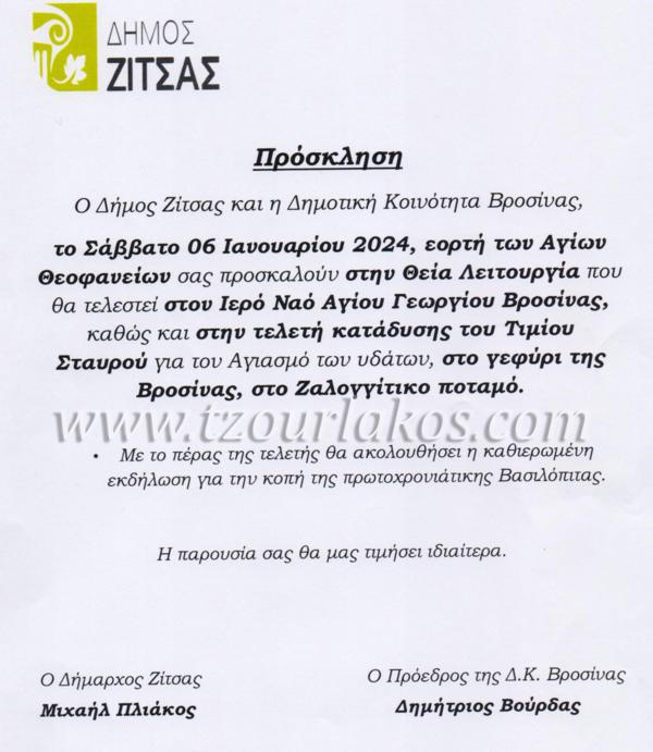Βροσίνα Ζίτσας. Αγιασμός υδάτων και κοπή πίτας το Σάββατο... Βροσίνα Ζίτσας. Αγιασμός υδάτων και κοπή πίτας το Σάββατο 6 Ιανουαρίου 2024. Θέλεις πραγματικά να γνωρίσεις την Ήπειρο;;Επισκέψου και κάνε και εγγραφή στο κανάλι μας TZOURLAKOS στο youtube. Tweet Προηγούμενο Επόμενο