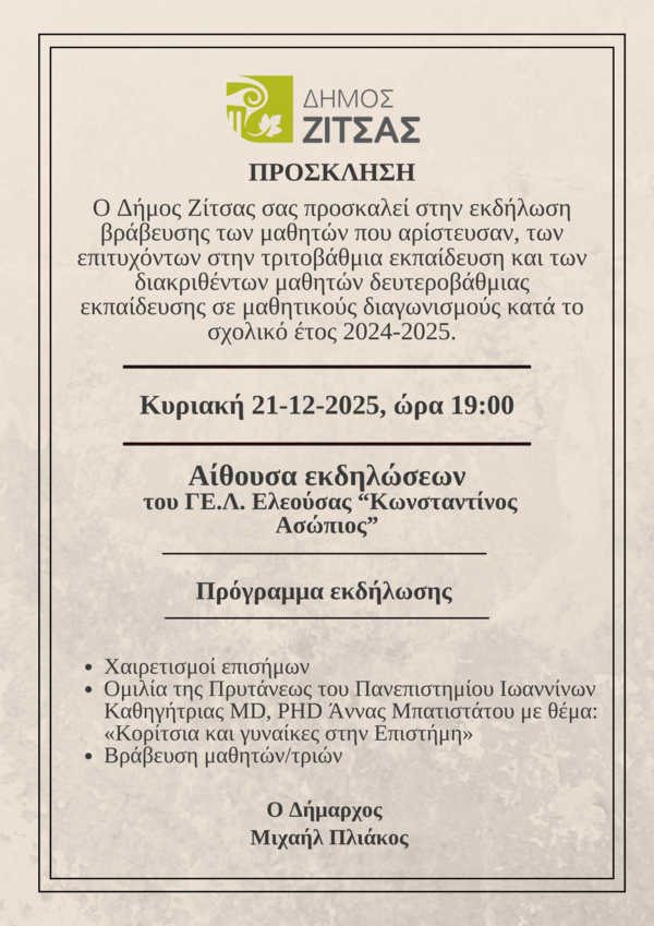 Ζίτσα Εκδήλωση Βράβευσης Μαθητών την Κυριακή... Ζίτσα Εκδήλωση Βράβευσης Μαθητών την Κυριακή 21 Δεκεμβρίου 2025 Γίνε μέλος της Ομάδας μας στο FB. Δώσε δύναμη στην προσπάθειά μας!! ►Ή 'Ηπειρος στήν Καρδιά μας!!!Τζουρλάκος Ιστός. Θέλεις πραγματικά να γνωρίσεις τα χωριά του Πωγωνίου,της Ζίτσας,της Κόνιτσας και όλα τα Ιστορικά και Εκκλησιαστικά Μνημεία τους;;Θέλεις να ακούσεις αυθεντικό κλαρίνο από Εκδηλώσεις και Πανηγύρια:::Επισκέψου και κάνε εγγραφή στο κανάλι μας TZOURLAKOS στο YouTube και διάλεξε ένα από τα 1400 βίντεο μέχρι στιγμής και συνεχίζουμε!.. Tweet Προηγούμενο Επόμενο