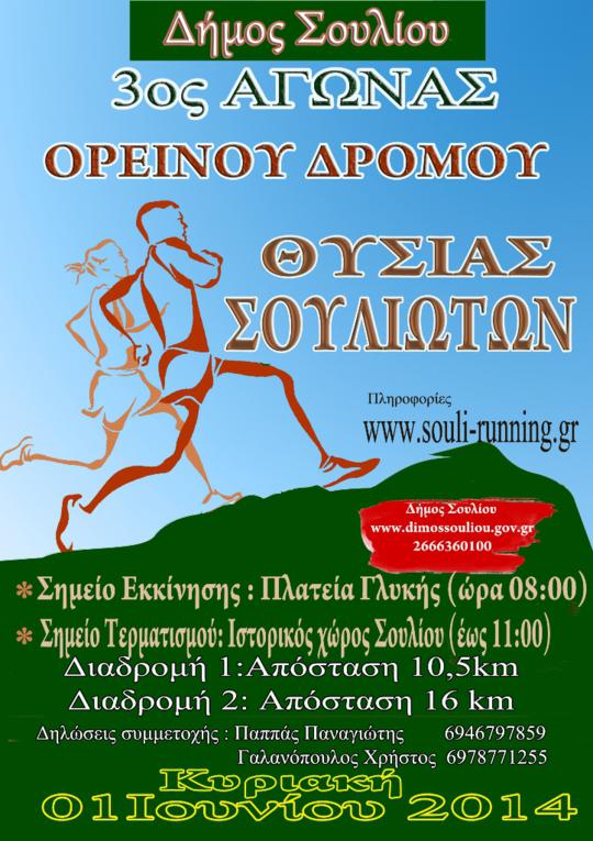 Κάνουμε γνωστό σε όσους ενδιαφέρονται να λάβουν μέρος σε μία εκ των δύο διαδρομών του προγραμματισμένου 3ο ορεινού αγώνα δρόμου θυσίας Σουλιωτών, που πραγματοποιείται στα πλαίσια των εορτών Σουλίου 2014, ότι θα πρέπει να βρίσκονται στην Τοπική Κοινότητα Γλυκής και στην αφετηρία, την Κυριακή 1 Ιουνίου και από ώρα 7:15 το πρωί, για την έγκαιρη δήλωση, καταγραφή, την επίδοση αριθμών και για την ομαλή διεξαγωγή του αγώνα.
