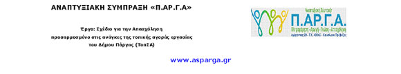 Η Αναπτυξιακή Σύμπραξη «Π.ΑΡ.Γ.Α» στο πλαίσιο υλοποίησης της Πράξης «ΣΧΕΔΙΟ ΓΙΑ ΤΗΝ ΑΠΑΣΧΟΛΗΣΗ ΠΡΟΣΑΡΜΟΣΜΕΝΟ ΣΤΙΣ ΑΝΑΓΚΕΣ ΤΗΣ ΤΟΠΙΚΗΣ ΑΓΟΡΑΣ ΕΡΓΑΣΙΑΣ ΤΟΥ ΔΗΜΟΥ ΠΑΡΓΑΣ» η οποία εντάσσεται στηδράση 7: «Τοπικά σχέδια για την απασχόληση, προσαρμοσμένα στις ανάγκες των τοπικών αγορών εργασίας» (ΤΟΠΣΑ) της κατηγορίας Παρέμβασης 1: «Ενεργητικές πολιτικές απασχόλησης» του Θεματικού Άξονα Προτεραιότητας 3: «Διευκόλυνση της πρόσβασης στην απασχόληση», του Επιχειρησιακού Προγράμματος «Ανάπτυξη Ανθρώπινου Δυναμικού 2007-2013», που συγχρηματοδοτείται από το Ευρωπαϊκό Κοινωνικό Ταμείο (ΕΚΤ) και υλοποιείται στην περιοχή του Δήμου Πάργας,