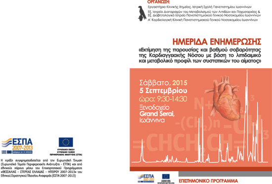 Στόχος της ημερίδας είναι η παρουσίαση του επιστημονικού έργου «Εκτίμηση της παρουσίας και βαθμού σοβαρότητας της Καρδιαγγειακής Νόσου με βάση το λιπιδαιμικό και μεταβολικό προφίλ των συστατικών του αίματος» καθώς και νεώτερων επιστημονικών δεδομένων για την Καρδιαγγειακή Νόσο. Το έργο ανήκει στην κατηγορία των έργων «ΝΕΑ ΓΝΩΣΗ» με Δικαιούχο το Πανεπιστήμιο Ιωαννίνων - Επιτροπή Ερευνών, που εντάχθηκαν στο Επιχειρησιακό Πρόγραμμα «ΘΕΣΣΑΛΙΑ – ΣΤΕΡΕΑ ΕΛΛΑΔΑ –ΗΠΕΙΡΟΣ 2007-2013» του Εθνικού Στρατηγικού Πλαισίου Αναφοράς (ΕΣΠΑ 2007-2013) και συγχρηματοδοτήθηκαν από την Ευρωπαϊκή Ένωση.