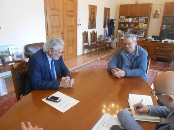 Θέματα που αφορούν δράσεις της Περιφέρειας Ηπείρου στον τομέα Πολιτικής Προστασίας και στις πρωτοβουλίες που έχει αναλάβει για την αξιοποίηση των ευρωπαϊκών προγραμμάτων, συζήτησαν ο Περιφερειάρχης κ. Αλέξανδρος Καχριμάνης με τον Επίτροπο Ανθρωπιστικής Βοήθειας και Διαχείρισης Κρίσεων της Ε.Ε. κ. Χρήστο Στυλιανίδη, ο οποίος επισκέφθηκε σήμερα την Περιφέρεια.