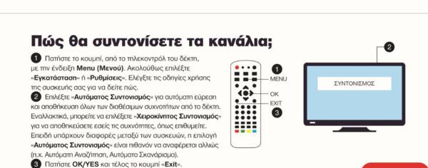 Πως γίνεται ο επανασυντονισμός; Θα χρειαστώ τεχνικό; Η διαδικασία είναι απλή. Δεν χρειάζεται τεχνικό: Πάρε το τηλεκοντρόλ, πάτησε μενού, επίλεξε εγκατάσταση ή ρυθμίσεις, αυτόματο συντονισμό και πάτησε ΟΚ.