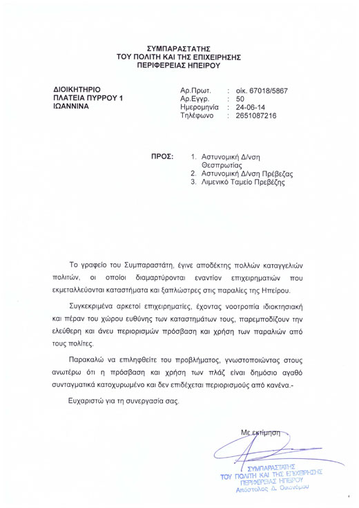 ΠΕΡΙΦΕΡΕΙΑ ΗΠΕΙΡΟΥ: Συμπαραστάτης τoυ πολίτη.Ελεύθερη η πρόσβαση των πολιτών στις παραλίες...