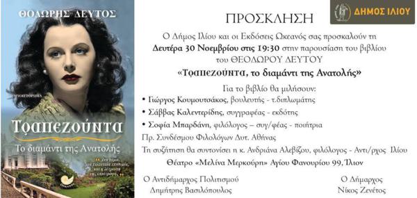 Παρουσίαση του βιβλίου του Ηπειρώτη Θεόδωρου Δεύτου ''Τραπεζούντα, το διαμάντι της Ανατολής'', τη Δευτέρα 30 Νοεμβρίου 2015, ώρα 19.30', στο Δημοτικό Θέατρο Ιλίου ''Μελίνα Μερκούρη'', Αγίου Φανουρίου 99. Ίλιον.