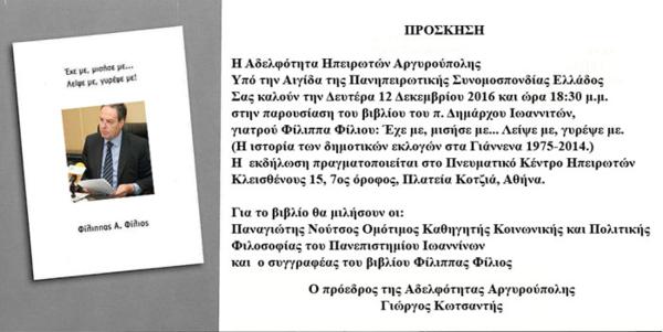 Ηπειρωτών Αργυρούπολης, υπό την αιγίδα της Πανηπειρωτικής Συνομοσπονδίας Ελλάδος, παρουσιάζει το αυτοβιογραφικό βιβλίο του πρώην Δημάρχου Ιωαννιτών γιατρού Φίλιππα Φίλιου, τη Δευτέρα 12 Δεκεμβρίου 2016, ώρα 18.30', στο Πνευματικό Κέντρο Ηπειρωτών, Κλεισθένους 15, 7ος όροφος, πλατεία Κοτζιά
