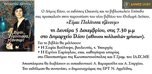 ''Eίμαι Πολίτισσα, Τζάνουμ''. Το βιβλίο του Ηπειρώτη συγγραφέα Θεόδωρου Δεύτου, στη παρθενική του παρουσίαση, τη Δευτέρα 5 Δεκεμβρίου 2016, ώρα 19.30', στο Δημαρχείο Ιλίου, Κάλχου 48, Ίλιον