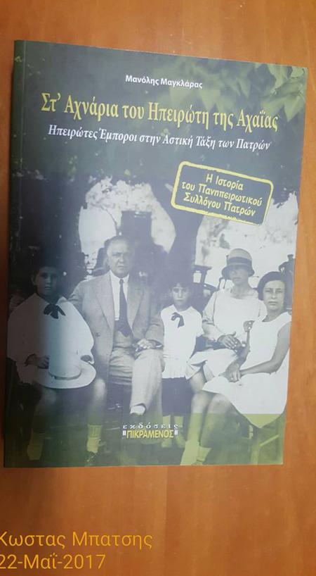 παρουσίαση, στο Πνευματικό Κέντρο Ηπειρωτών, τη Δευτέρα 22 Μαίου 2017, του βιβλίου, ''Στ΄ αχνάρια του Ηπειρώτη της Αχαϊας. Ηπειρώτες έμποροι στην αστική τάξη των Πατρών. Η ιστορία του Πανηπειρωτικού Συλλόγου Πατρών''. Του Μανώλη Μαγκλάρα. Που μαρτυρεί στο διηνεκές τη δημιουργική παρουσία και προσφορά των Ηπειρωτών της αποδημίας.