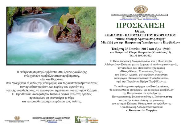 Με ένα ξεχωριστό καλλιτεχνικό γεγονός, την προβολή του Ηχοράματος «Βίκος-Θύαμις: Χρονικό στις Εποχές Μια ωδή στην ηπειρωτική ύπαιθρο και το περιβάλλον» του Βασίλη Λάππα, Φωτογράφου, Σκηνοθέτη και Παραγωγού Οπτικοακουστικών Πολυθεαμάτων, τιμά την παγκόσμια ημέρα Περιβάλλοντος η Πανηπειρωτική Συνομοσπονδία και η Ομοσπονδία Αδελφοτήτων Καλαμά, την Τετάρτη 28 Ιουνίου 2017 στην αίθουσα του Πνευματικού Κέντρου Ηπειρωτών (Κλεισθένους 15) και ώρα 19:00 .