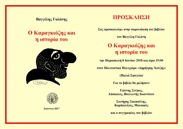 Την Παρασκευή 8 Ιουνίου στις 19.00 στην αίθουσα «Δημήτριος Χατζής» στα Παλιά Σφαγεία θα γίνει η παρουσίαση του βιβλίου του Βαγγέλη Γαλάνη «Ο Καραγκιόζης και η ιστορία του». Την εκδήλωση θα συντονίσει ο αναπληρωτής καθηγητής της ιατρικής κ. Γιάννης Δημολιάτης. Για το βιβλίο θα μιλήσει ο βουλευτής του ΣΥΡΙΖΑ Γιάννης Στέφος, ο καρδιολόγος Σωτήρης Σκοπούλης αλλά και ο συγγραφέας.