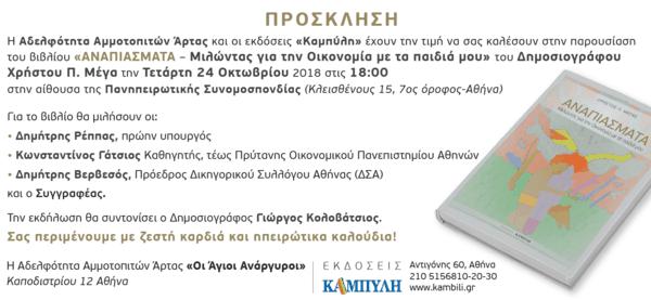 Υπό αυτό το πρίσμα και θέλοντας να αναδείξουμε το έργο του χωριανού μας και μέλους της Αδελφότητας – κάτι που κάναμε και θα κάνουμε σε κάθε περίπτωση και στο μέλλον για κάθε ανάλογη προσπάθεια των χωριανών μας - θέσαμε υπό την αιγίδα μας την παρουσίαση του Βιβλίο του: «ΑΝΑΠΙΑΣΜΑΤΑ – Μιλώντας για την Οικονομία με τα παιδιά μου» (Εκδόσεις Καμπύλη-Αθήνα 2018) που θα πραγματοποιηθεί την Τετάρτη 24 Οκτωβρίου 2018 στις 18:00 στην αίθουσα της Πανηπειρωτικής Συνομοσπονδίας (Κλεισθένους 15 Αθήνα, Πίσω από το παλαιό Δημαρχείο, Μετρό Ομόνοια).