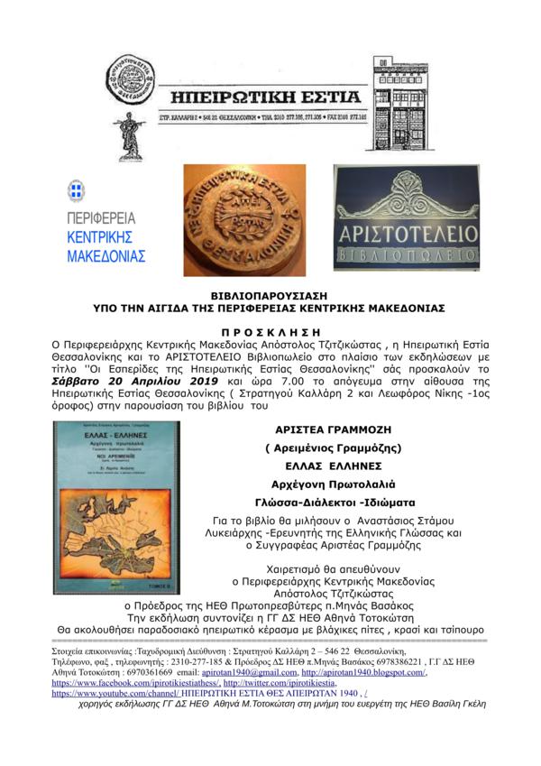 Ηπειρώτικη Εστία Θεσσαλονίκης.Βιβλιοπαρουσίαση υπό την αιγίδα της Περιφέρειας Κεντρικής Μακεδονίας