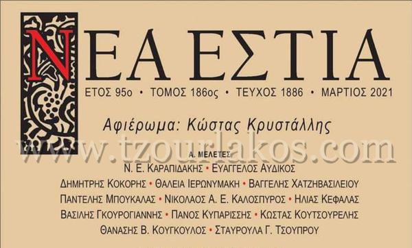 Το περιοδικό «Νέα Εστία», το πιο παλιό απ’ όλα που υπάρχουν σήμερα, με διαρκή παρουσία στα ελληνικά γράμματα, αφιερώνει το τεύχος του Μαρτίου του 2021 στον συμπατριώτη μας δημιουργό, τον Κώστα Κρυστάλλη. Πρόκειται τόσο για κορυφαία πράξη αναγνώρισης της παρουσίας του και της συμβολής του όσο και εκδήλωση τιμής προς τον περιπετειώδη βίο και τη σεμνή μορφή του Συρρακιώτη δημιουργού, που δεν μπορεί να εγκλωβιστεί στην αγκαλιά μόνο των Συρρακιωτών. Άνοιξε τα φτερά του και έγινε το σύμβολο πολλών ανθρώπων σ’ όλη την Ελλάδα.