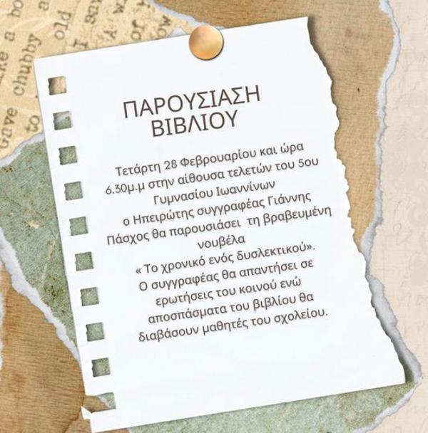 Ο Διευθυντής και ο Σύλλογος Διδασκόντων του 5ου Γυμνασίου Ιωαννίνων στα πλαίσια της ευαισθητοποίησης γονέων και παιδιών με μαθησιακές δυσκολίες, έχουν την τιμή να σας προσκαλέσουν στην εκδήλωση – παρουσίαση του βιβλίου « Το χρονικό ενός δυσλεκτικού» του συγγραφέα Γιάννη Πάσχου η οποία θα πραγματοποιηθεί την Πέμπτη 28/2/2024 στην αίθουσα τελετών του σχολείου.