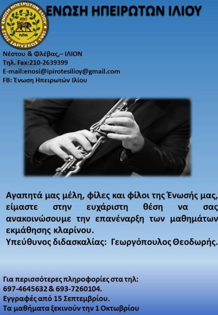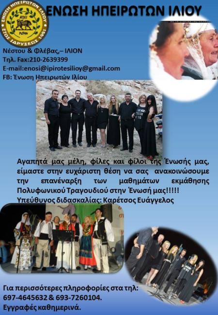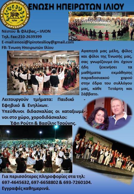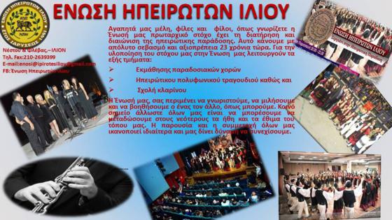 Η 'Ενωση Ηπειρωτών Ιλίου και την νέα χρονιά λειτουργεί τμήματα εκμάθησης παραδοσιακών χορών όλων των ηλικιών και σχολές πολυφωνικού τραγουδιού και κλαρίνου. με δάσκαλο τον εξαίρετο κλαρινίστα Θοδωρή Γεωργόπουλο.