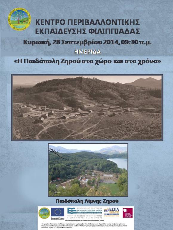 Το Κέντρο Περιβαλλοντικής Εκπαίδευσης Φιλιππιάδας διοργανώνει Ημερίδα με τίτλο: « Η Παιδόπολη Ζηρού στο χώρο και στο χρόνο», την Κυριακή 28 Σεπτεμβρίου 2014, ώρα 9.30' το πρωί στον χώρο των εγκσαταστάσεων της λίμνης Ζηρού.