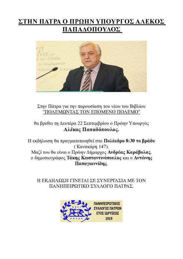 ''Πολεμώντας τον επόμενο πόλεμο''. Το βιβλίο του Αλέκου Παπαδόπουλου, παρουσιάζει ο Πανηπειρώτικος Σύλλογος Πατρών, την Δευτέρα 22 Σεπτεμβρίου 2014, ώρα 20.30' στο Πολύεδρο, Κανακάρη 147, Πάτρα