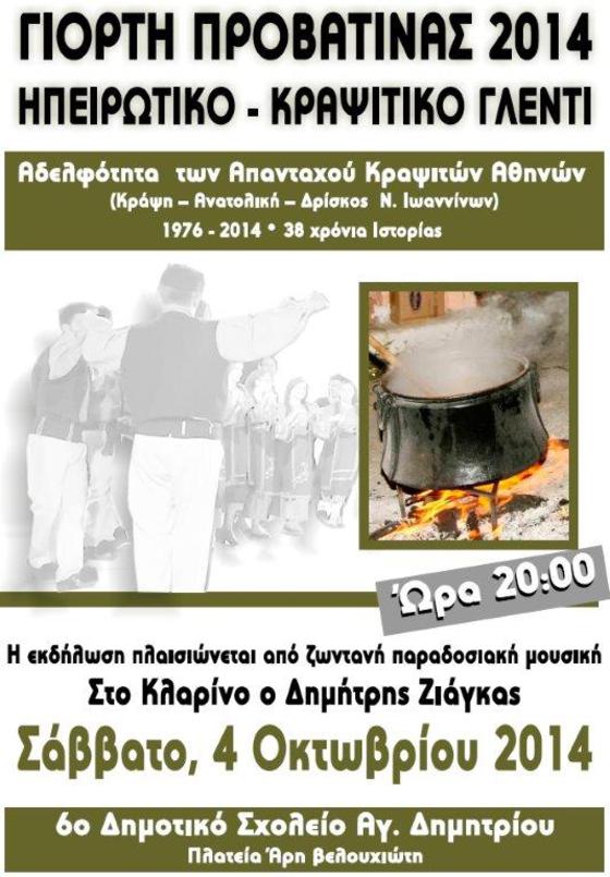 Η Αδελφότητα Κραψιτών Αθηνών για δεύτερη φορά οργανώνει τη ''Γιορτή Προβατίνας'', το Σάββατο 4 Ολτωβρίου 2014, ώρα 20.00' στο 6ο Δημοτικό Σχολείο Αγίου Δημητρίου, Ηπείρου 1, απέναντι ακριβώς από το οίκημα της Αδελφότητας.