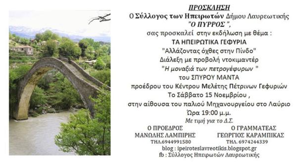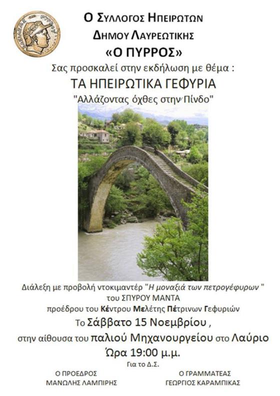 Ο Σύλλογος Ηπειρωτών Λαυρεωτικής, διοργανώνει την εκδήλωση ''Τα Ηπειρώτικα γεφύρια. Αλλάζοντας όχθεις στην Πίνδο'', το Σάββατο 15 Νοεμβρίου 2014, ώρα 19.00' στην αίθουσα του Παλιού Μηχανουργείου στο Λαύριο.